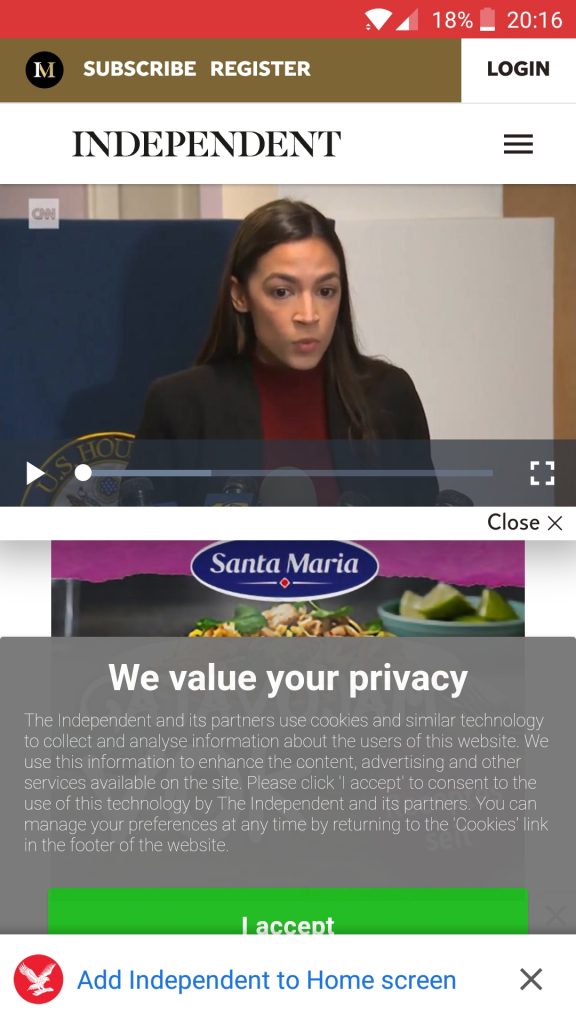 Jaunākā mode, kā telefonos attēlot ziņas. Augšējos 50% no ekrāna aizsedz nevienam nevajadzīgs video logs. Es gribu izlasīt rakstu, nevis to klausīties. It sevišķi, ja esmu publiskā vietā un man nav austiņas, ko telefonā iespraust.